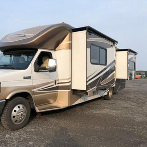 打开车门豪华的气息迎面而来:模块化的设计,可以在驾驶室加装多媒体设备,甚至还有USB媒体连接接口。福特E450房车的车头很有明星范儿。车门有两层,多出来的那层是纱门,露营时防蚊虫用的,很人性化。门一打开,电动升降踏自动放下,感觉很科幻!车身有三处可向外拓展的仓室,可以扩大车内空间。驾驶仓设计很美国范儿,真皮座椅很软很舒适,包裹性极好。