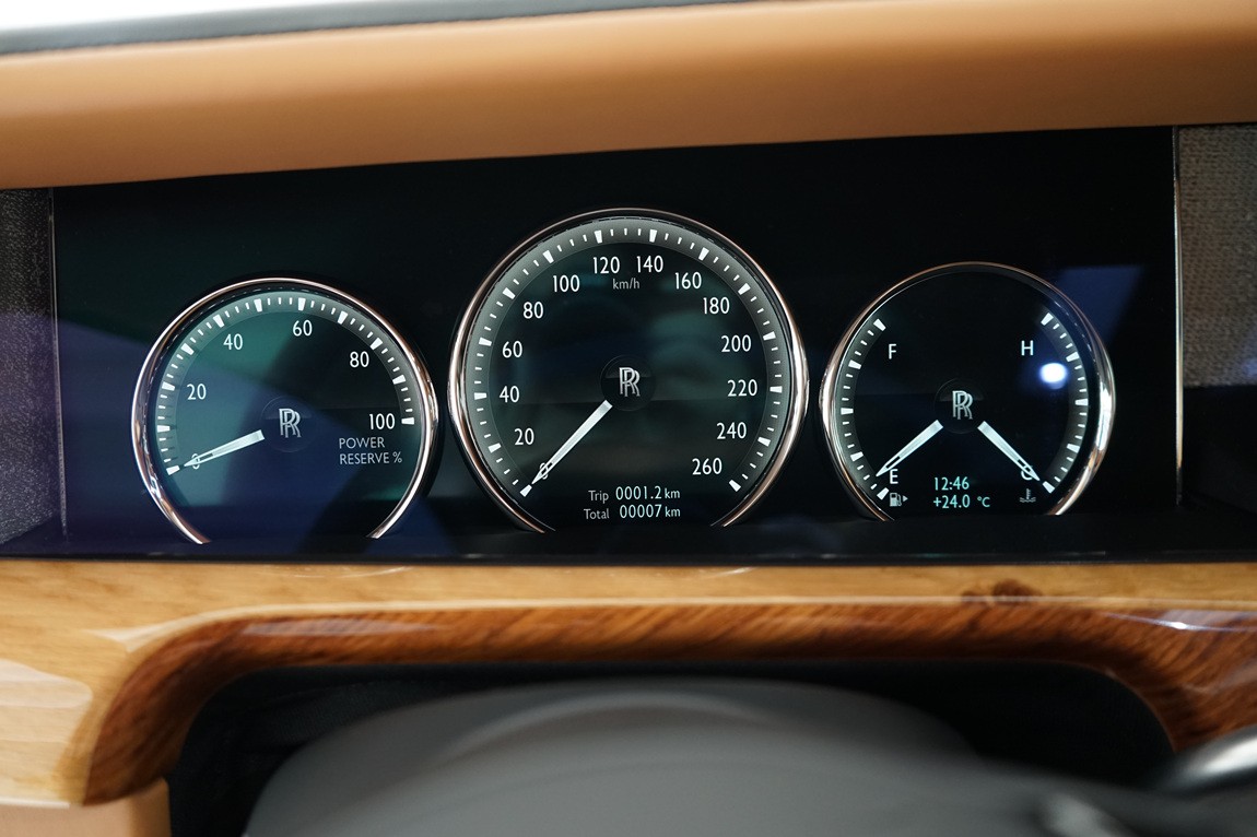 全新幻影猛地看上去似乎依然是那副老样子,但实际上新车的中控台除保留了原有的方正线条外,布局上还是有着一定幅度改动的。首先,真皮多功能方向盘的三根辐条依旧呈现Y字形,两侧则融入了更多的多功能按键;带有物理边框的12.3英寸全液晶仪表盘采用三圆式设计,其也可以看作是传统设计与前沿科技的结晶。