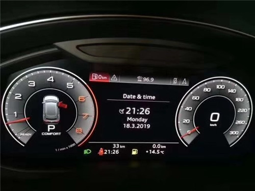 2019款奥迪Q8由7种不同驾驶模式,包括越野模式。在越野状态下,如果是自适应空气悬挂版本将底MI显示器上,供驾驶员参考。在6%以上的陡坡道上,陡坡缓降控制以自动制动输入提供支持,最高速度30公里/小时盘抬至最高,离地间隙可达254毫米、标准悬挂版离地间隙为220毫米。电子底盘平台感知车辆的倾角,并将信息显示在M。