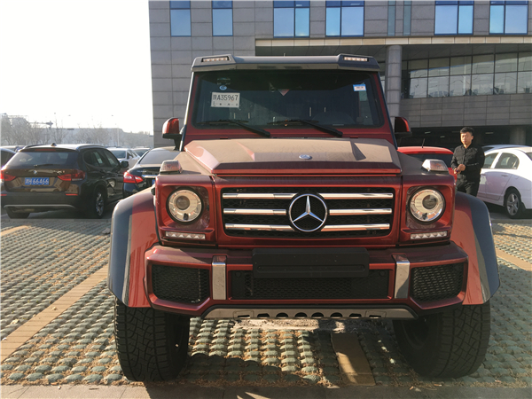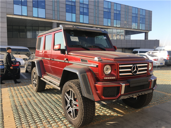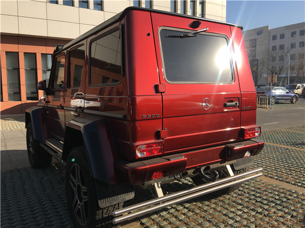 18款奔驰G500 (配置|询价)4X4²基于G500标准版打造,仍由奥地利格拉茨工厂生产。两车共用结实的梯形车架,轴距同为2850毫米。但动力系统源自新推出的AMG GT (配置|询价),底盘借鉴了G63 (配置|询价) AMG6×6的设计,此外还对车身进行了一些修改。奔驰G5004X4² 不过外观并不低调,前保险杠被分成了三个方形的进气口。奔驰G5004X4²轮圈则装上了和AMG款式相的大五星款式,并采用黑色设计,加上整个黑色的车身,流露出霸气的气质。