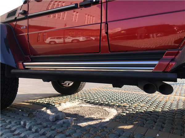 奔驰G500搭载5.0LV8发动机,机器增压器的装备使得它在1800rpm时就能爆发出80%的最大扭矩,具有216kw/5500rpm的最大功率和456nm/2800-4000rpm的最大扭矩。底盘有好几道增强梁举行加固,前后整体桥式悬挂系统粗壮极度,绝对是最强壮的民用车之一。