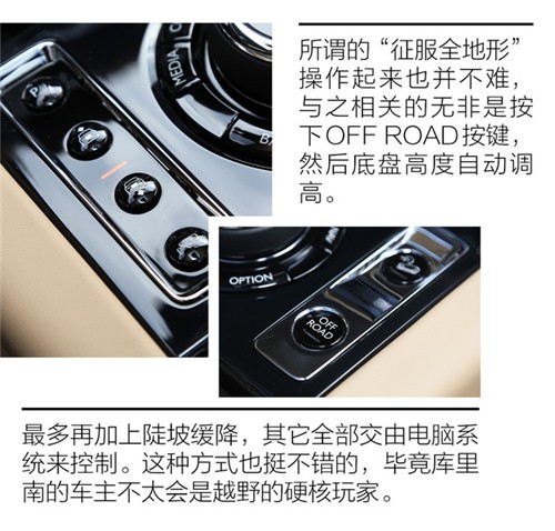 征服全地形”操作起来也并不难,与之相关的无非是按下OFF ROAD按键,然后底盘高度自动调高,最多再加上陡坡缓降,其它全部交由电脑系统来控制。这种方式也挺不错的,毕竟库里南的车主不太会是越野的硬核玩家。