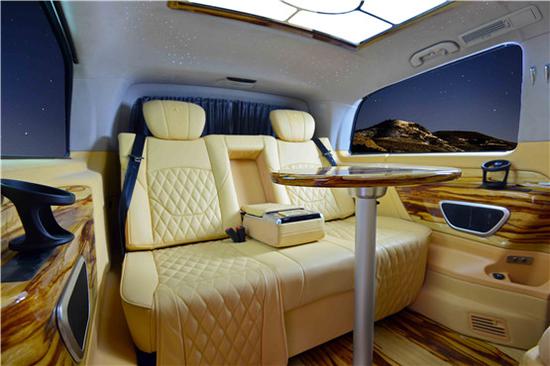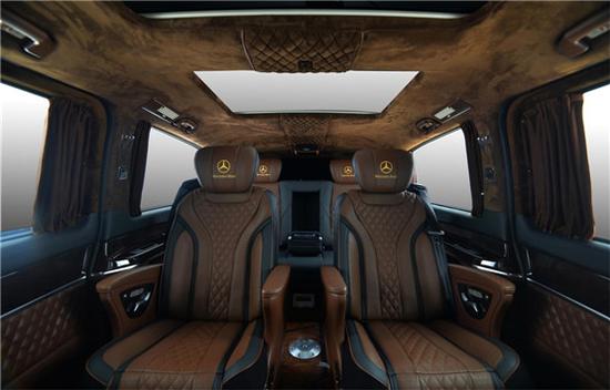 奔驰V260改装车,整体设计具有一定的延续性,新车采用了全新奔驰家族化前脸设计,双横幅前进气格栅搭配全LED大灯,整体风格庄重而肃穆。奔驰V级 (配置|询价)采用了短前悬设计,侧面线条平直,给人以四平八稳的视觉效果,比较符合V级的定位。尾部整体设计方正,在后挡风玻璃以及照架处使用了少量倾斜线条,增加了活力。尾灯同样采用了LED光源,点亮后辨识度与观感都比较出色。