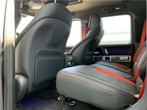 全新G63后座椅缝线和配色与前排保持一致,较长的坐垫对大腿的支撑更好,在宽度和高度上保留了老款的优势,对腿部空间也有所加大,靠背角度调节功能的加入值得肯定,长时间乘坐放缓靠背,可以更好的休息。