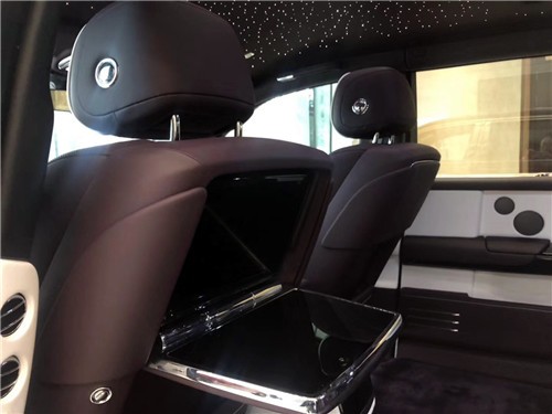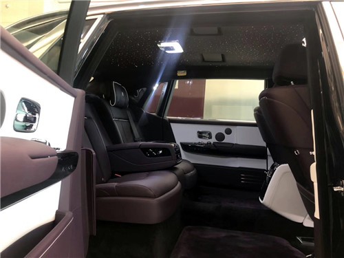 电动折叠板和后排影院系统被巧妙的隐藏在前排座椅的椅背后,只需轻触按钮,便可以自如收放桌板和影院系统,带来完美的剧院体验。后排中央固定扶手做了重点优化,其中国可容纳带有威士忌酒具的酒柜、香槟酒具和冷藏箱,方便乘客畅快交谈,后排座椅角度可以任意调节,这一设计让客户无需转头便可视线自如交流。整个车厢内饰全部以最精美的高档材料装饰,使车内极具触感。
