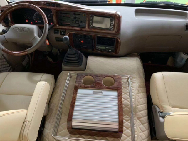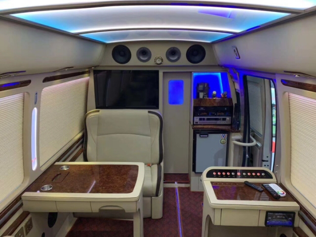 丰田考斯特豪华改装实拍效果 丰田考斯特改装商务车在内饰的设计上是极其贴心的,车载冰箱的设计贴心备至,高档的办公桌设计方便我们在商务办公中的需要。而车顶的LED大灯设计更是可以满足我们照明的需要。丰田考斯特车内航空顶灯以及车内驾驶席的半桃木装饰,这些设计在效果的展示上提升了丰田考斯特改装商务车的档次。