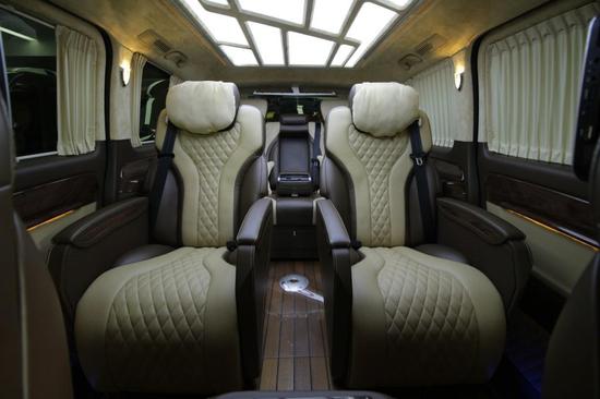 奔驰威霆改装商务车高顶配置表:全车采用原一次性冲压钢制车顶、柚木地板、电子触摸屏、可移动办公桌、立体环绕声系统、进口空气座椅(通风、供暖、按摩、电动腿拖、前后调整,旋转180度)。
