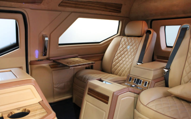 骑士十五世仪表台由两个中间两个电子屏幕可以控制多媒体、导航以及车载影像系统,这套影像系统分别有安装在车前后两个热成像摄像机和普通摄像机提 供信息源。因为在车门上安装了透明和不透明装甲,为了支持其重量,车门的铰链均实用专利技术进行加固,预防铰链周围的金属出现金属疲劳现象。车的内饰也绝对对得起他的售价。威尔顿羊绒地毯、Andrew Muirhead皮革制品、6向可调电动座椅、遮阳玻璃、置于侧面的笔记本电脑托盘、LED发光显示仪表盘、AlpineDVD导航和蓝牙端口,即以方便驾驶的夜视仪和车尾摄像系统。至于车内娱乐系统,黑色奢侈的形象也只有PS3和他最配。