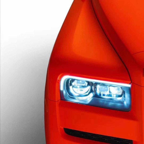 车头保持了与全新幻影一致的风格。巨大而高耸的帕特农神庙样式进气格栅端庄威严,下方的包围富有层次感。矩形的LED大灯来自全新幻影,远光使用了先进的激光光源,夜间照射距离达到600米。库里南配备的激光大灯用于远光辅助照明。从这一角度看去,大灯外侧弧形灯组的上半部分,以及内侧长方形灯组右边的灯头提供近光照明;内侧灯组左边灯头、以及弧形灯组下半部分的反光板结构提供远光照明。而激光光源将从反光板里面的矩形透镜射出,在满足一定的行驶条件后才能自动开启。