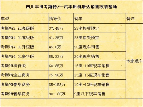 丰田考斯特改装商务车出产于四川一汽,发起机型号为丰田原装进口4.0L V6发起机,很多人问现在丰田考斯特还有没有柴油版的或许希望卖一辆进口的考斯特,首先,柴油版丰田考斯特成都一汽现已不再出产,由于新款的4.0汽油车动力更强,愈加环保,而进口的考斯特只有一款2.7L发起机,在发起机品质上进口丰田考斯特的发起机现已来落后一汽丰田考斯特(柯斯达 (配置|询价))的新款4.0L V6发起机,并且进口丰田考斯特都是国三规范,在国内现已无法,由于车子自身是中东进口,所以在国内是没有保修的。
