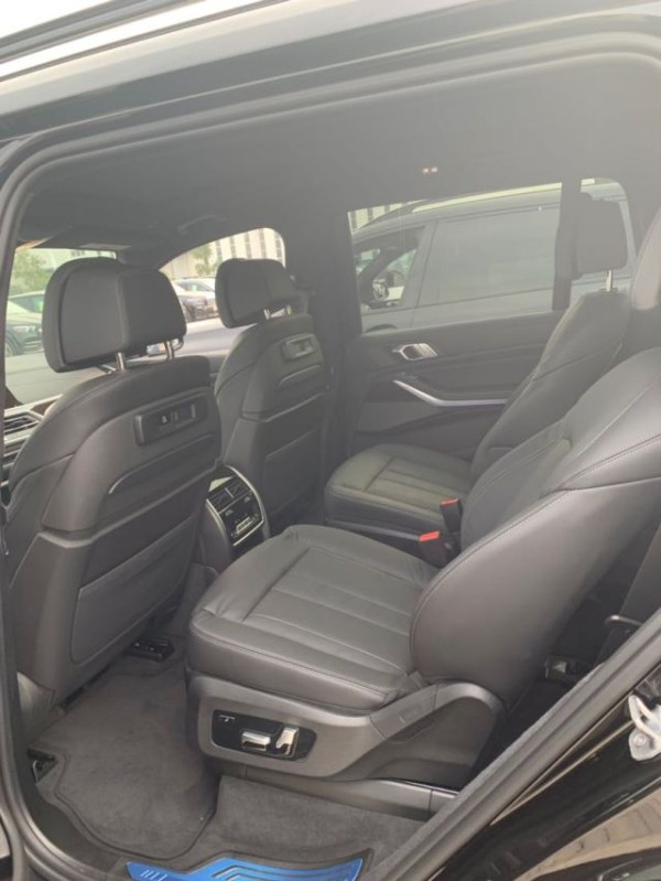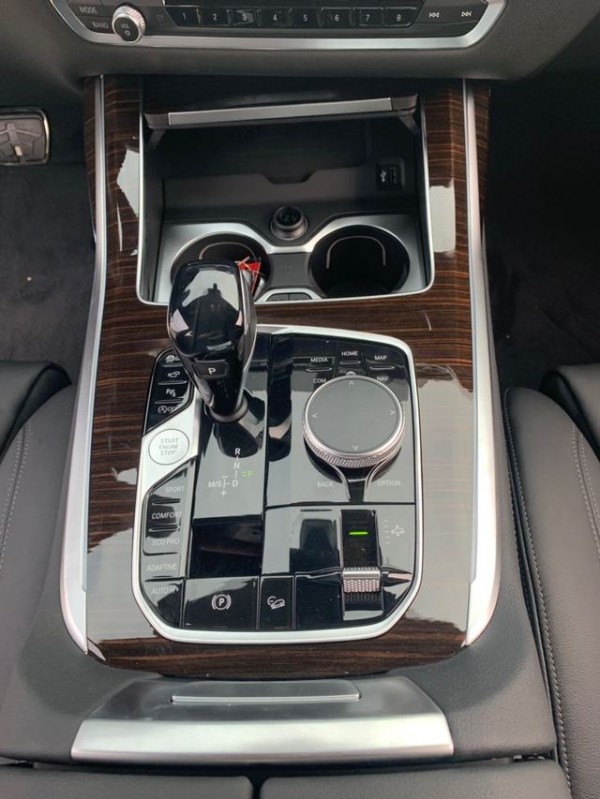 19款宝马X7内饰部分,宝马X7采用最新家族式设计语言,使用大量真皮、木纹饰板进行包裹。配备12.3英寸带有注意力检测的全液晶仪表和12.3英寸悬浮式触控显示屏。空调出风口与温度显示屏、实体功能按键结合在同一区域,并使用银色装饰条进行点缀。下方盖板下方为带有加热、制冷功能的杯架。