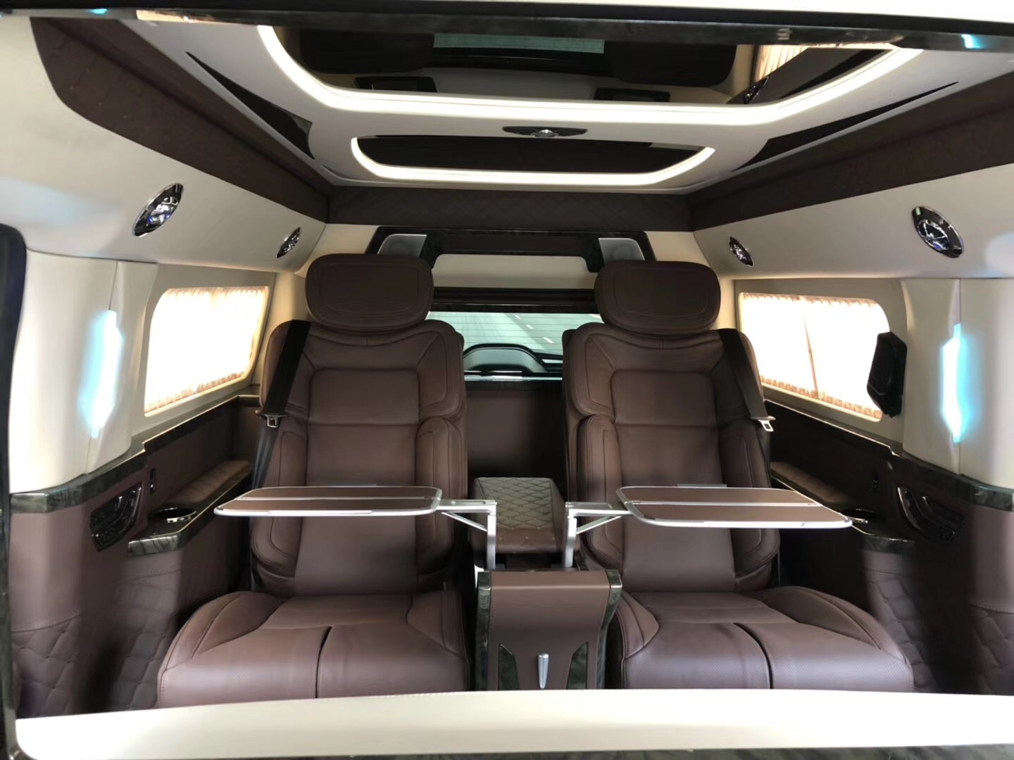 林 肯领袖一号共有6个座位,前端是两个折叠式座椅,也称为秘书座,后排座椅是主座,它带有电加热,通风和按摩功能,最大程度还可以放平休息,出远门时候,它是最适合的,累了可以按摩,渴了可以烧水喝,无聊可以看看新闻和上上网。它具有着低调中奢华般的气质,全尺寸SUV式的车身构造,自动踏板自动升降,迎接 你上下车使用,显得你身份十分尊贵,林肯领袖一号后舱内饰;整车采用4+2座椅分布,2个电动隐藏座椅+中央电动吧台组合,可以成为一个小型会议室,地板 是高级柚木地板,中间镶嵌铜条,手工制作,方便打理,2个航空座椅可以加热通风,180放平。全车内氛围灯都是经过法国设计师之手,无时无刻不体现浪漫。