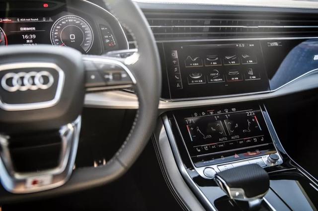关于内饰,我不想进行过多的赘述,全新奥迪Q8承袭了A8 (配置|询价)的设计宗旨,导入了三块屏幕的设计,但是相较于A8而言,由于SUV风格的关系,中控台更显厚实,因此除了更大面积的饰板以外,还加入了更多软质皮材包覆,而平底运动方向盘以及一体式运动座椅也很好的体现了全新奥迪Q8的运动特性。