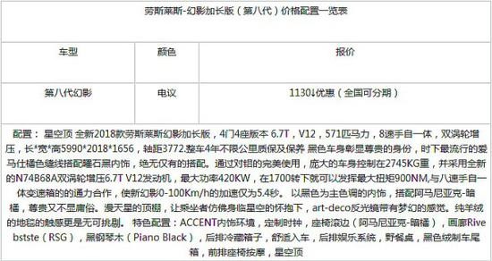 劳斯莱斯-幻影 (配置|询价)已经做到了人尽皆知,他堪称业内经典,车头展翅欲飞的欢庆女神车标,更是寓意代表着劳斯莱斯无限的优雅、迷人,走(开)到哪儿都是令人瞩目的焦点,也是大多数拥有豪车梦的车迷“梦想中的光影”。