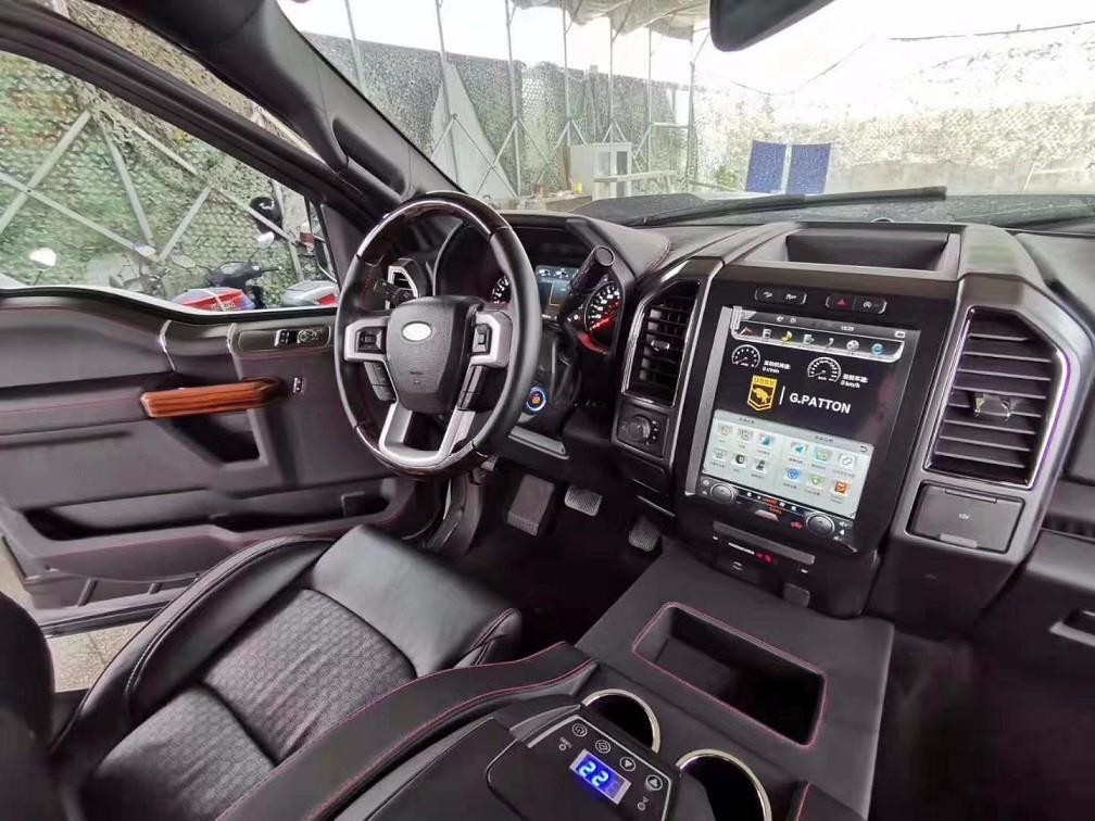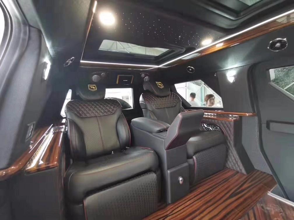 新款乔治巴顿战车的内饰可以用“奢华”、“精致”、“体贴”来形容。后舱采用了豪华商务车布局,内饰色调以米白色。酒红色两种搭配,北美皇家桃木做以装饰;前、后舱之间设有隔屏,配以22寸超薄显示器,在最大程度上保证了后舱乘客的私密性的同时又可以在旅途中享受影音快乐;舒适独立的多功能电动真皮座椅,让您置身其中会忘记自己身处外观如战车般的乘坐舱内。
