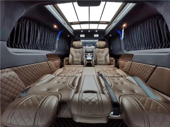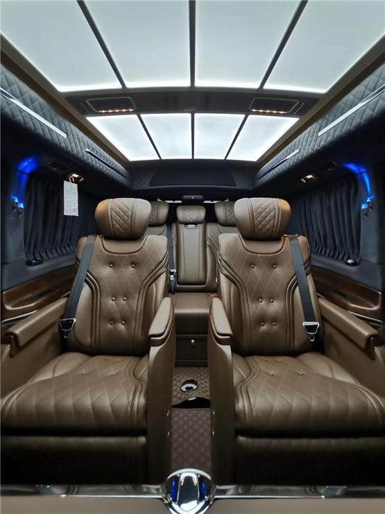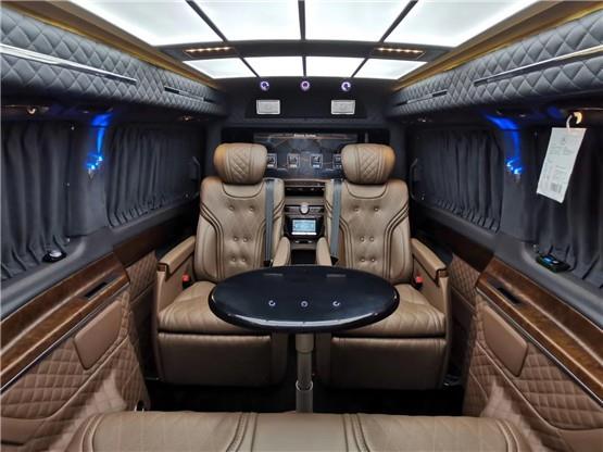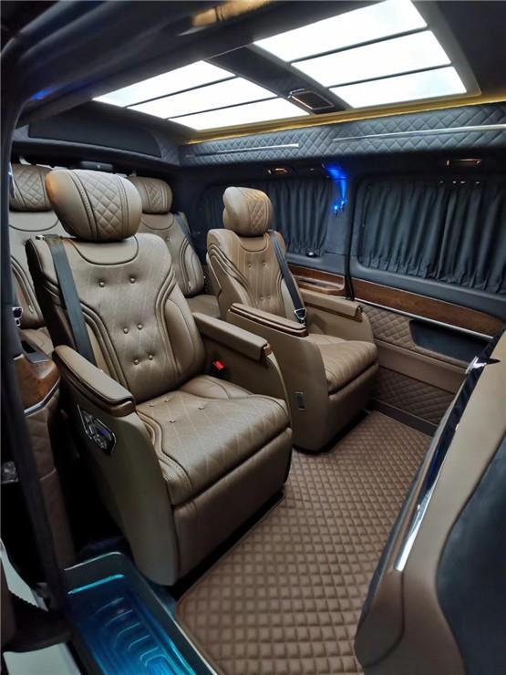 奔驰V260L改装全隔断迈巴赫版VS680第二排座椅采用两个迈巴赫62S首长级座椅,带加热,按摩,通风,一键式电动调节记忆等功能。奔驰V260L改装全隔断迈巴赫版VS680座椅符合人体工程学设计,同时带有电动椅背调节,电动头枕,电动前后调节,180度旋转,一键式伸缩腿托功能,带来头等舱级舒适体验,,私家客厅级后舱体验,180度旋转后可以与第三排电动沙发床进行无缝拼接,满足两个成年人一个小孩的正常休息,带来卧室级舒适享受。