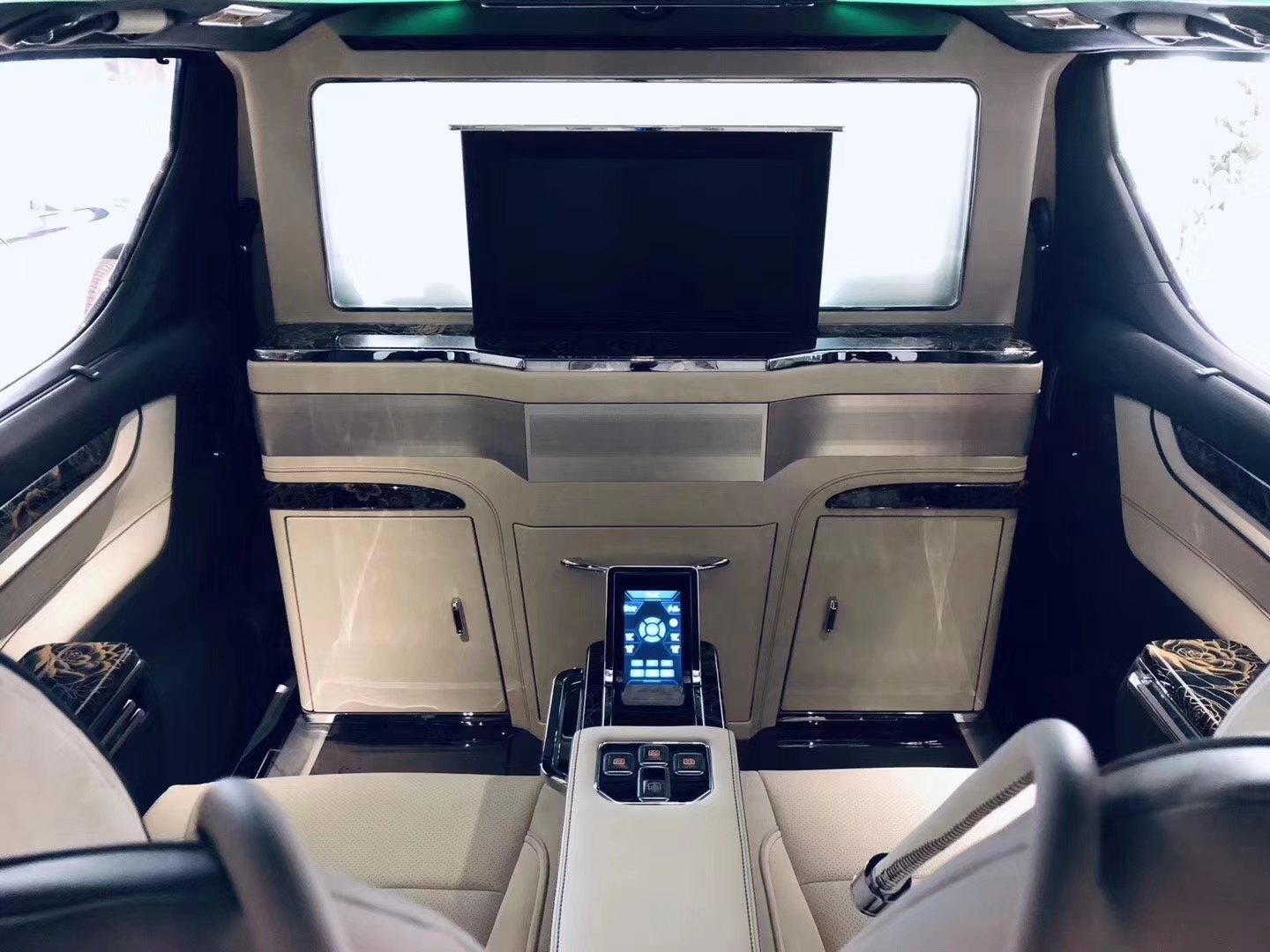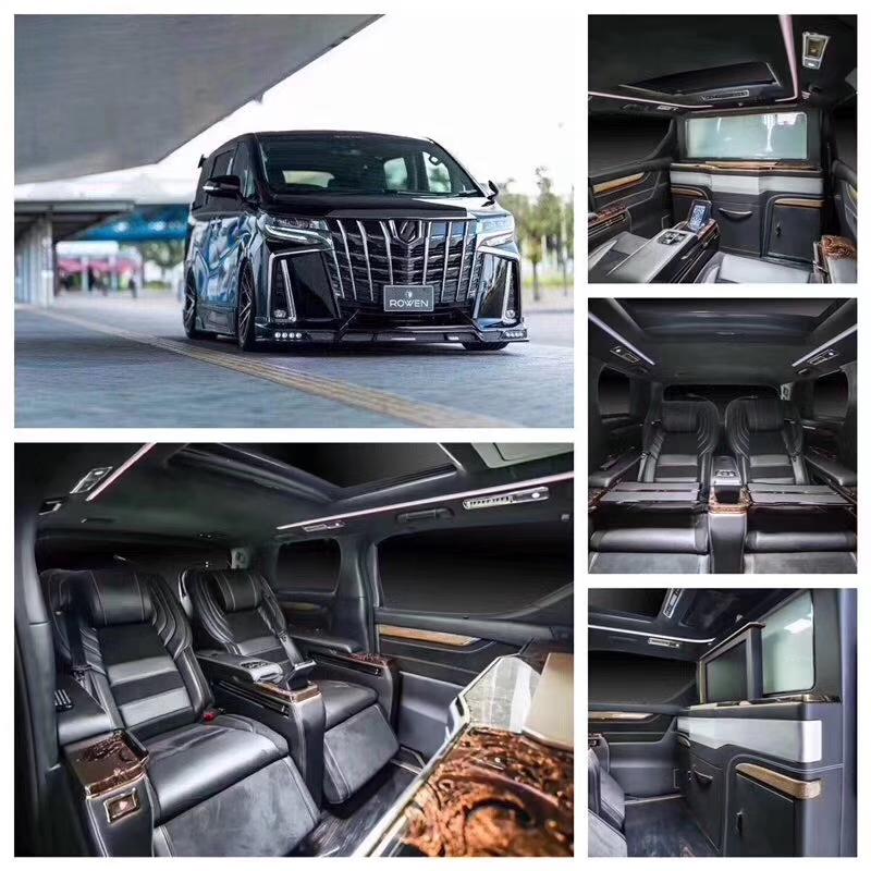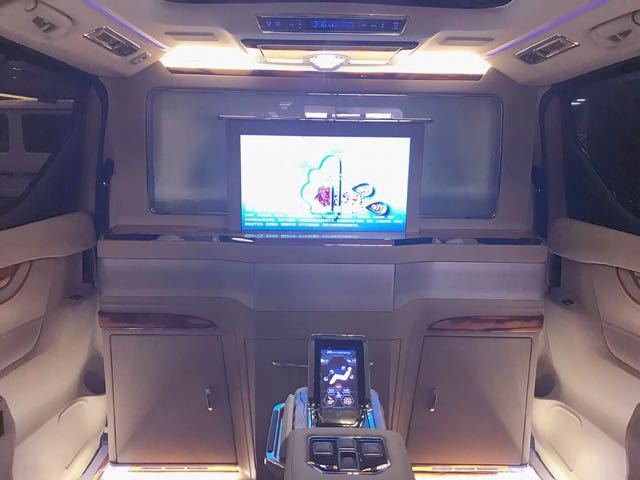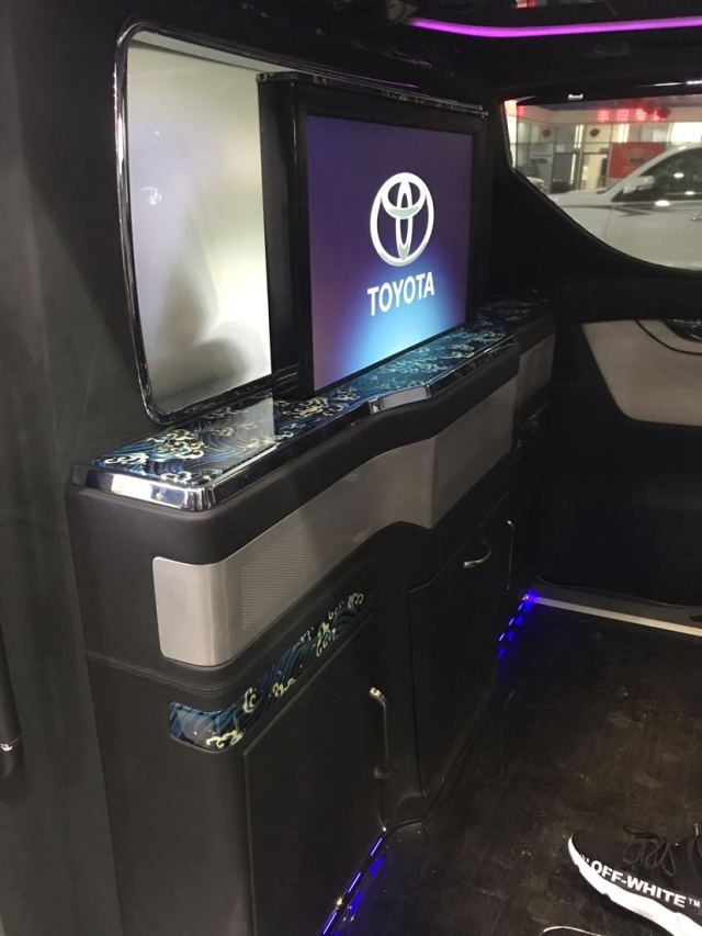 ● 整车立体大包围19款丰田埃尔法蒙娜丽莎总裁版、前后仓隔断式、隔断处增加一键式升降雾化玻璃、一键式可升降电视、音响功放、储物箱、车载冰箱。