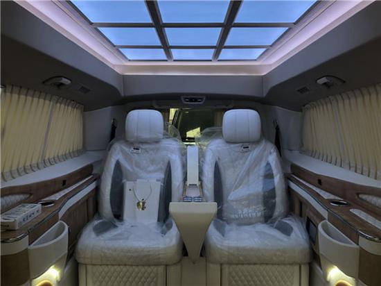 奔驰V260商务车迈巴赫版改装隔断六座全车采用真皮包覆,缝线细腻,柚木地板覆盖,处处体现了匠心之处。顶部搭载可调节的氛围灯、壁灯等,时尚的温馨感,与空调的造型排列,很有层次感。驾驶舱中间人性化的设计了冰箱。新款奔驰V250商务车迈巴赫版改装隔断六座运用平直坚挺的线条绘制出整车的轮毂,整车造型很低调沉稳、