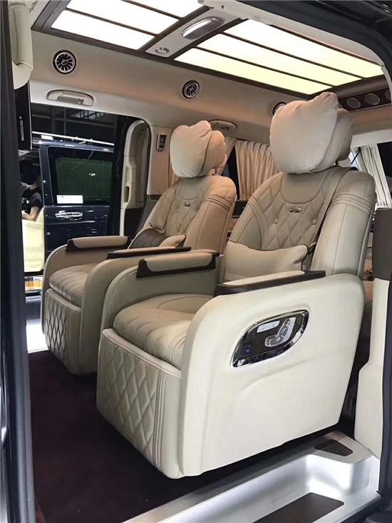后舱是一个舒适之地,两张航空座椅规格之高超越迈巴赫,选用进口小牛皮包裹触感细腻,缝线精致,更拥有超长腿托,多向调节、电动按摩、座椅加热通风等功能。座椅双侧有电动电脑桌,在左侧还配有苹果电脑连接车内WiFi随时可在车内办公。总裁座椅中央为控制区域,超大液晶屏可实现氛围灯开关、电视升降、隐藏座椅开关、以及布艺窗帘的开关。