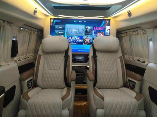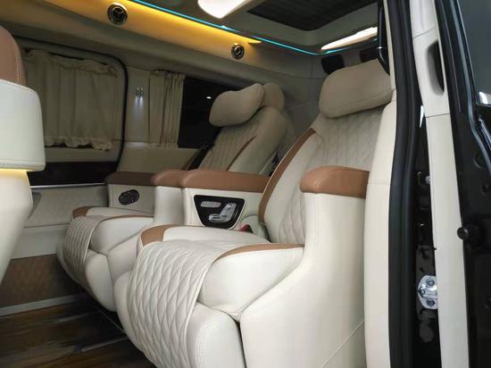 奔驰商务车V260L高顶隔断,后舱座椅为2+3的配置,座椅采用真皮包裹,采用奔驰S级 (配置|询价)迈巴赫棱形格缝制工艺和皮质激光打孔工艺,使得座椅能够更好的通风透气,还能有效的防止了螨虫等细菌的滋生,也方便对座椅进行清洁养护。两个独立航空座椅,他们不仅座面宽大舒适而且内部填充高密度海绵久坐不变形,而且具有完美的衬托感!具有通风、加热、气动按摩等功能以及腿拖,通过座椅侧面对开关进行控制调节,可以保证极致舒适的乘坐体验。