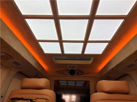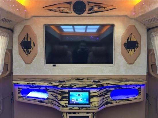 首先是一开门您回发现这款奔驰V260采用的是前后排隔断的处理方式,更好的为大家提供隐秘性并且大大提升了后排的娱乐体验。隔断采用的是40寸曲面屏电视后排的乘客可以通过隔断下方的中央操控面板控制的电视升降和车内灯光的调节。如果需要跟前排的驾驶员沟通您可以把隔断放下跟驾驶员有更好的沟通环境,包括隔断下方的镀铬装饰大大的提升了车内的豪华感。