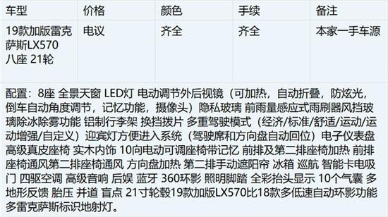 19款加版雷克萨斯LX570车内精致奢华,舒适至极。实木三幅式方向盘兼具温润触感与典雅质感,真皮部分可在短时间内加热。木材的纹理与质感,打造独具匠心的别致细节。精心鞣制的半苯胺高级真皮座椅,皮质专家花费数月的等待和甄选,只为令您在触摸瞬间尽享非凡质感。出色的仪表盘架构,配以豪华而先进的设计,莹亮的光电子仪表盘清晰易读。4.2英寸的综合信息显示屏,让信息一目了然。12.3英寸高清晰液晶屏应用防反光技术,同时配备SD卡地图导航、带语音识别的雷克萨斯导航系统。