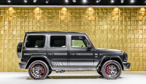 外观设计:G 63 Edition 1车身表面采用了哑光黑色车漆,配合12根竖置镀铬前格栅和黑色多辐轮圈,极具视觉冲击力。为了进一步营造运动感,该车的轮圈边缘、外后视镜等处还加入了红色元素点缀。此外,该车外观式备胎还采用了亮黑色设计,看上去更加动感。