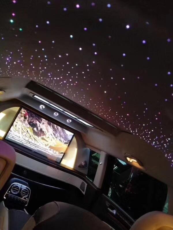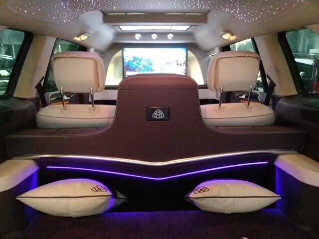 配置:十二向电动座椅调节带记忆,电动调节方向盘,三区空调,智能卡,一键启动,多功能方向盘,电动踏板,翻毛鹿皮内饰包裹,前后舱隔断吧台,隔断升降可雾化隐私玻璃带天鹅绒电动窗帘,可升降电视,沉香檀木内饰,奢华满天星空顶灯,后仓原车小床,柏林之声音响,电动窗帘,羊绒地毯。后舱电器中控屏,触摸控制电器、影音设备的开关与调节,豪华大尺寸,7个控制页面实现车内电器近40项开关调节功能。车内搭载4G无线网络,卫星电视、Bose环绕音响、蓝光DVD影碟机,大屏液晶电视可实现电动升降。豪华多功能前置吧台:意式新款NESPRESSO咖啡机、水晶酒杯、迷你酒柜。。。等等。
