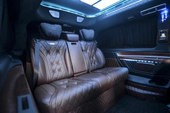 奔驰V250迈巴赫S680乘客舱第二排多功能座椅,可旋转,并带有脚托功能,舒适乘坐,附有加热、通风、电动调节、腿托、按摩、记忆、电动头枕、电动靠背等功能,座椅支持180度旋转。