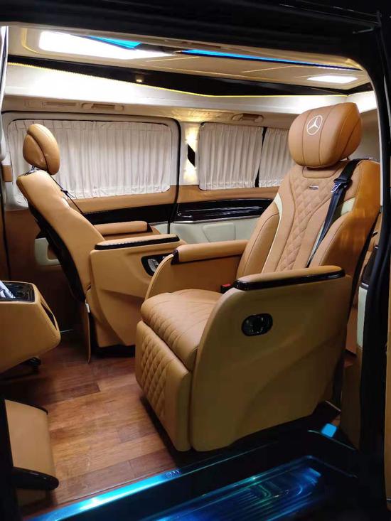 奔驰V260L高顶版的座椅采用飞机头等舱级别座椅 按照亚洲人的体型做出了相应的设计 座椅整体采用打孔Nappa真皮包裹 与舒适性填充物匹配 给予最高的乘坐舒适感 座椅支持多向电动调节、座椅按摩 通风/加热、腰部支撑调节、腿托 不管是躺着还是坐着;随时享受不同的乘坐体验