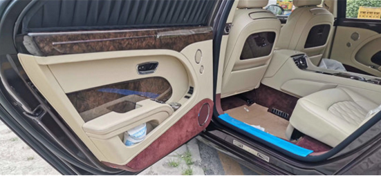 内部充分利用额外的后排空间,宾利研发了航空式电子腿托,组装在两个后排座椅的基座上。腿托可以向外延伸和旋转,为后排乘客提供直立、放松、倾斜等不同座椅位置的乘坐体验。在慕尚长轴距版的两个后排座椅之间,有一个控制台,还提供各种实用功能,例如USB接口、笔架、杯托和玻璃盖储存区。实木饰面采用未经漂白的天然木材以纯手工方式制作,纹理脉络完全匹配,在整个座舱营造出精致细腻的表面,充分展现优雅尊贵的气质。所有实木饰面均经过精挑细选、来源可靠,采用镜面对称工艺悉心打造而成。每张饰面材料首先要经过 72 小时熟化处理,再与取自同一棵树、同一部位的另一张饰面材料精准对位。