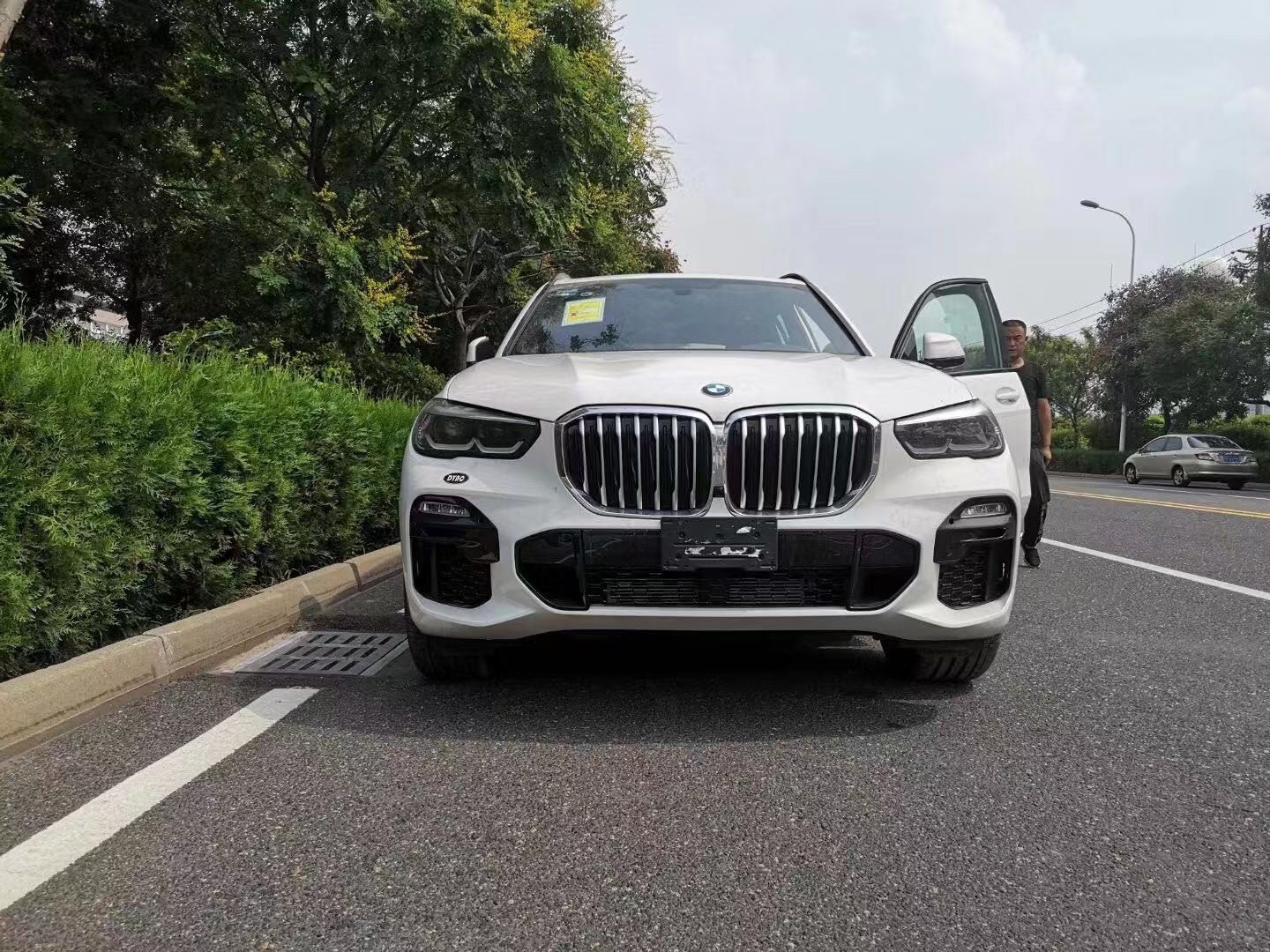 这是2019款宝马X5 xDrive40i M动套装版,上面还有一款尊享M动套装版,目前新一代X5就这两款车型投放。宝马X5目前已进入第四代产品周期,外形上基本还是延续上一代宝马X5的设计,但在细节上还是可以看出这台X5比老款更加凶猛犀利。之前的“双肾格栅”尺寸变得更大,边缘的镀铬也加粗了。前杠包围造型非常动,中间及两侧都是镂空的通风格栅,中网格栅及下格栅都可以主动调节开闭角度。大灯是鹰眼般的造型,边缘线条比较硬,看着英气十足。这台样车的大灯配置非常高,光灯是LED,远光灯是LED+激光,LED日行灯、自适应远光、自动头灯、LED前雾灯都是标配项目,完全不输“灯厂”奥迪。