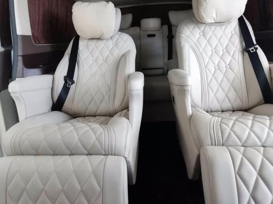 2018款奔驰V250迈巴赫S680乘客舱第二排多功能座椅,可旋转,并带有脚托功能,舒适乘坐,附有加热、通风、电动调节、腿托、按摩、记忆、电动头枕、电动靠背等功能,座椅支持180度旋转。