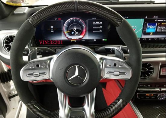全新G63的内饰极具现代感,两块12.3英寸的显示器则让整个内饰氛围升华,中控台多处均采用碳纤维材料覆盖,点缀着红色元素的碳纤维饰板,很有战斗犯,带彩色TFT显示屏的AMG仪表盘、AMG主菜单和单独的挡位显示器。空调是这种菊花样式出风口。还提供了经典、运动、渐进三种模式可选。座椅记忆、前后座加热、座椅按摩,AMG多功能方向盘(可控制自适应巡航、语音控制、多媒体控制等)