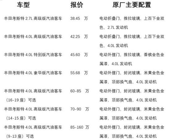 丰田专卖店新款柯斯达 (配置|询价)、考斯特、9座、10座、11座、12座、13座、15座、16座、17座、19座、20座、23座现车销售, 豪华内饰改装。丰田考斯特11座至尊版、柯斯达12座(奢华版、旗舰版、VIP版)13座(VIP版、超VIP尊贵版、至尊旗舰版)16座(超VIP版、超VIP商务版)17座(VIP版、超VIP商务版)颜色米黄金属色、合格证与座位相符!