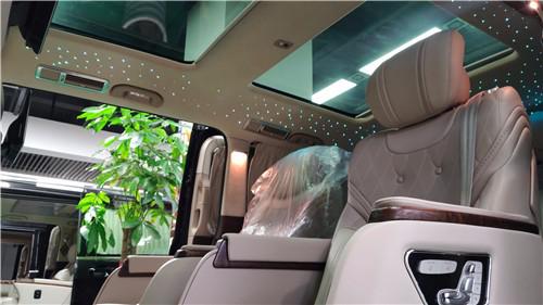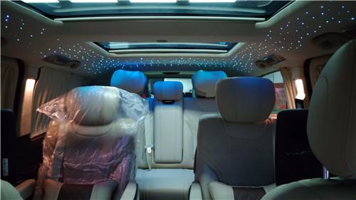 2019款奔驰V260L改装商务车第二排航空座椅为带电动、加热、按摩、通风功能的航空级首长席,可沿着地面上滑轨实现一键电动式前后滑动,对于这种智能化的乘坐体验,是原厂车型笨拙的手动拖拽模式所望尘莫及的。车内的氛围灯打开后,居然是满天星的设计。
