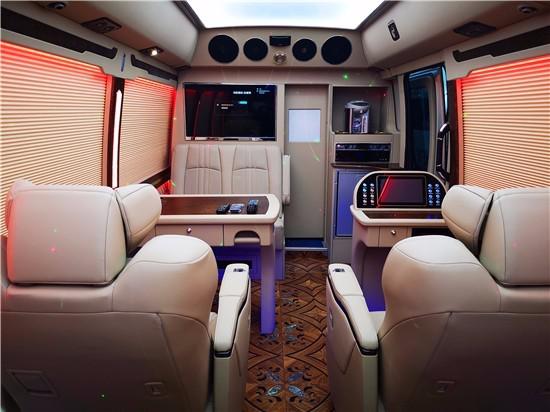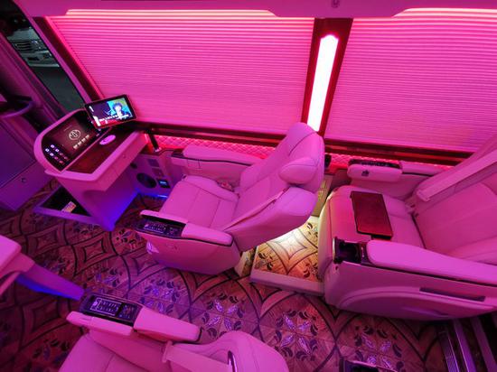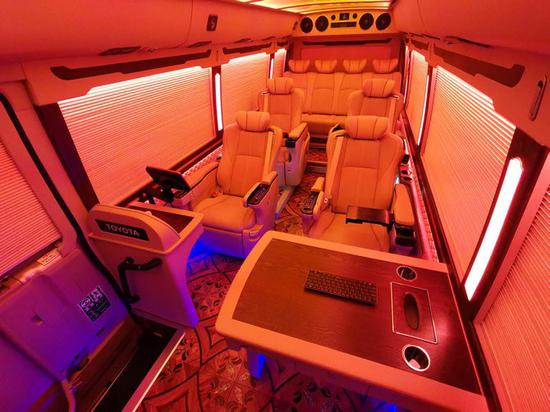 办公桌或者秘书桌也是丰田考斯特12座必备品,在车辆行驶途中方便领导临时办公。丰田考斯特12座航空座椅也是较为突出的特色,电动调节、电动加热、电动脚托,满足不同需求。电动百褶窗帘精选产自韩国,防阻燃、防静电。A380空壳顶灯可以调节12座种不同色彩,每一种颜色瞬间切换的过程也是一种舒心的享受。冰箱、烧水壶、冷热毛巾柜都是比较实用的车内设施。