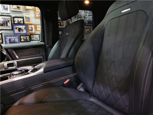 新款奔驰G63提供多种配色内饰,动型AMG座椅座椅上配有真皮打孔或钻石图案拼接的设计,同时在安全带、手刹以及方向盘等皮质接缝处还采用充满激情的红色缝线,让特别版车型的内饰氛围别具一格。19款奔驰G63配备了独立的前悬架,在四个角增加了AMG专用的螺旋弹簧改善操控,还增加了一个支柱塔架以提高刚度,稳定杆减少车身横摇,自适应阻尼器和速度敏感转向系统,还配备了五种路面和三种越野驾驶模式。
