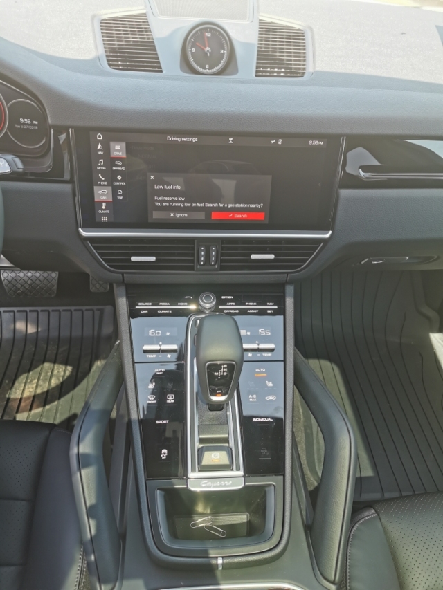 19款保时捷卡宴内饰最吸引人的地方就是科技感较强,而且触摸键的感觉也是很不错的,不会出现盲操不方便的情况。该车的车顶材料是翻毛皮的,非常的抗脏,但是味道也大。中控屏的尺寸是12寸的,显示效果很好,操控性也很不错。并且还选装了一些功能,像倒车影像这个配备是360度的,效果很好。2019款保时捷卡宴的底盘,是4D的,很舒服。身高是1.86m,坐在车里面还感觉很宽,跟轿车相比还是SUV更舒适。
