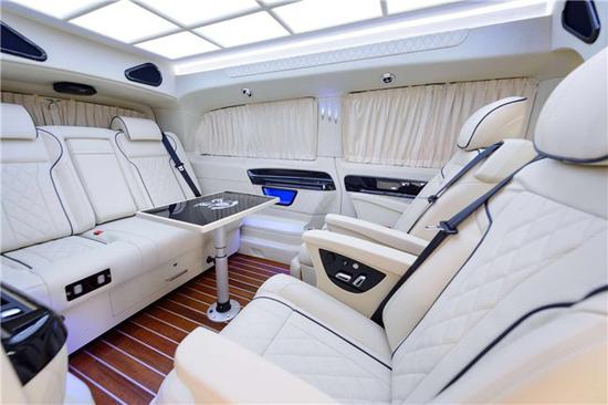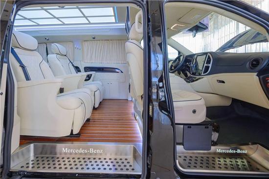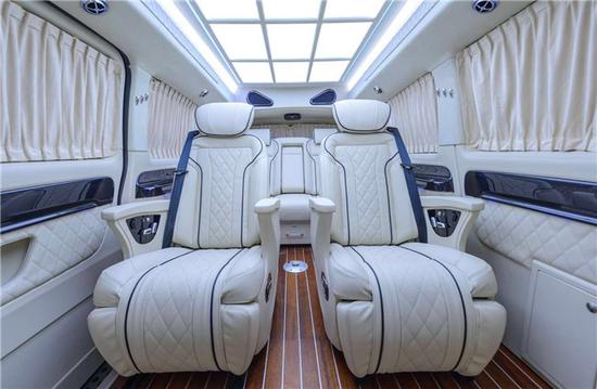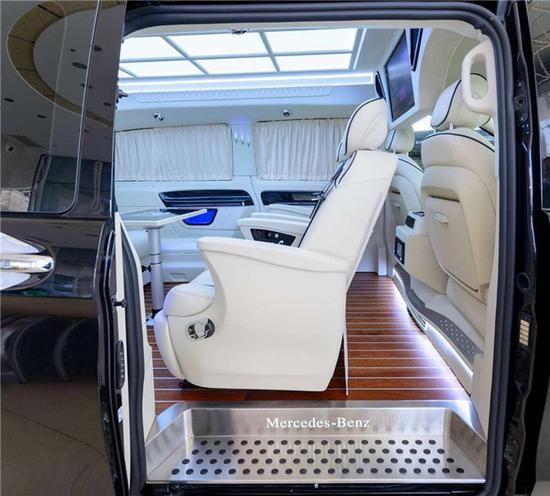 从外观上来看,相对于原本的一些奔驰威霆,在改装的过程当中的改动比例比较大,在宽度和高度上也能够进行加长,长度和轴距上没有任何的变化,一眼看上去很难分别出威霆的普通版的区别,而且整个改装的过程当中的基本上也都是在3430毫米和奔驰威霆的普通版来讲是保持一致。整个汽车还增加了两侧踏板,能够更加方便乘客上下车。