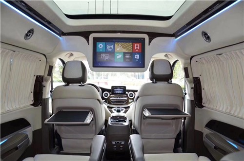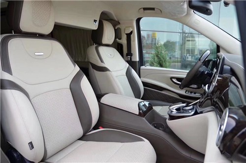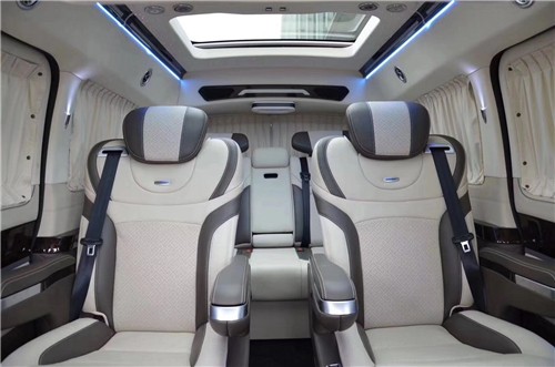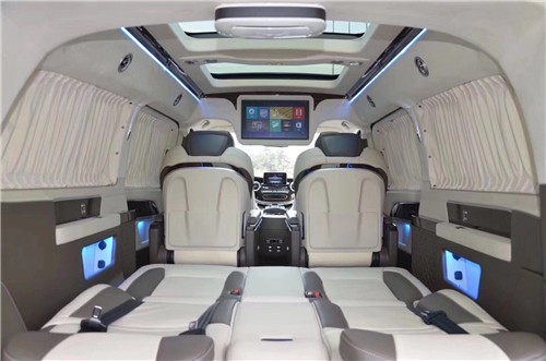 后舱前为两个独立航空座椅,第二排座椅安装进口首席航空座椅,加热通风按摩功能齐全,最大限度的减缓您的乘车疲惫。八向电动调节:电动头枕,电动腿托,前后电动调节,电动靠背调节。第三排为一组沙发座椅(可电动展平,形成一张舒适的沙发床)。