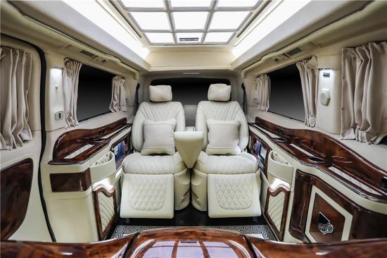 奔驰威霆钻系列全车采用隔断设计,实木吧台可电动收展成隐藏式秘书座椅,吧台于座椅完美结合,吧台中嵌英国进口游艇级钟表,座椅采取迈巴赫S500反向座椅。影音娱乐系统,32寸超薄可升降液晶电视、日本健伍音响、蓝光DVD,以及电动办公娱乐桌板系统、12V可翻转热水壶、指纹识别保险柜、酒柜,对于商务谈判来说,这一切的配置都来得恰到好处。
