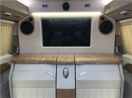 奔驰V260L这款车最值得说的是他的多功能娱乐系统,在驾驶舱的后方有32寸可升降高清液晶电视,音响设备则是来自日本的建伍5.1声道音响,还有后舱内的氛围灯都可以通过这个控制台进行调节,车舱内配置了空气净化器,随时保持车内空气新鲜,后舱如在客厅般舒适。隔断电视下方是多功能吧台一键式电动伸展开是两张隐藏式秘书座椅,配备有进口胶囊咖啡机与蓝光玻璃酒柜这一类生活性的应用,满足日常的商务休闲需求。