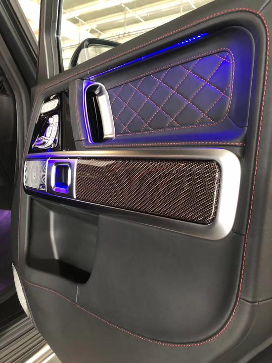 19款奔驰G63 AMG精选皮革搭配多疤。大多数奔驰的电子系统都出现在这个全新的豪华内厢里,包括COMAND和HD卫星导航系统。中控台多处均采用碳纤维材料覆盖,带彩色TFT显示屏的AMG。