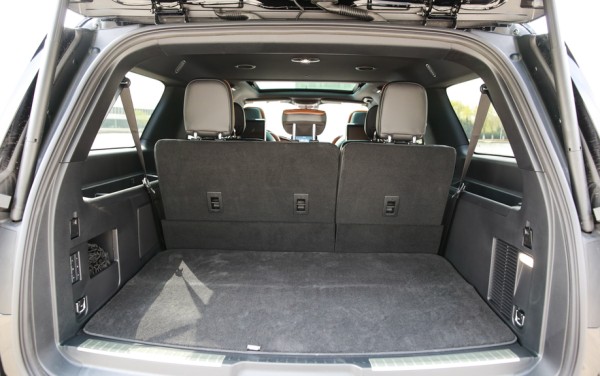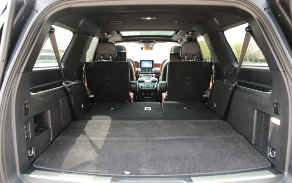 新款领航员,设计师好像从一开始就不担心它的空间。座椅采用2+2+3的布局,可以随意折叠调配,二三排折叠,立刻变身货车,车内空间扩升至2926升。领航员的第三排空间比很多7座MPV还要好。身高1.85米的体验者坐到第三排,无论头部还是腿部都有富余的空间。不过,遗憾的是第二排座椅并不能前后移动,所以第三排的腿部空间拓展性差一些。另外,领航员第三排座椅可以在行李厢进行电动放倒和立起来,方便了有大体积行李时的装载。电动尾门的按键在左侧,而非尾门上,这会让刚接触的人有些不知所措。