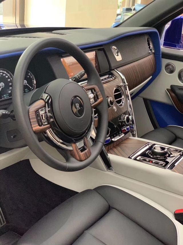 相比外观的传统,内饰上库里南除了给人华贵外,还植入更多新鲜感,首先大量木纹设计和皮革奠定了新车的豪华感,其次全新液晶显示屏和数字化中控面板又悄无声息的告诉人们它在与时俱进。前排设计,体现出了非常好的逻辑性和整洁性,从上到下都有很好的层次感,线性的前台,然后是一体化横置的仪表,中控屏,饰板。再下一层是由一整块木板水平对开整合的木纹饰板和空调,据劳斯莱斯介绍,每辆库里南车上的木纹饰板都是完全不同的,采用唯一的纹理,一辆车便是一棵树。