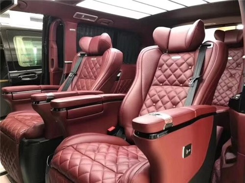 进口V250改装奔驰迈巴赫VS680在座椅的遴选上更是一丝不苟,全新进口航空头等舱座椅,甄选最顶级的头层小牛皮包覆,手工缝线打孔工艺更是精细无比,菱形的走线纹路纹路让人在一瞬间以为是迈巴赫S级 (配置|询价)轿车附体,迈巴赫VS680商务车座椅自带的通风加热,电动按摩更是不必再详细赘述,加大尺寸的座椅头枕更是能够让乘客在旅途中尽享豪华舒适。十二向的座椅调节功能简直可以让出乘客在车内“为所欲为”