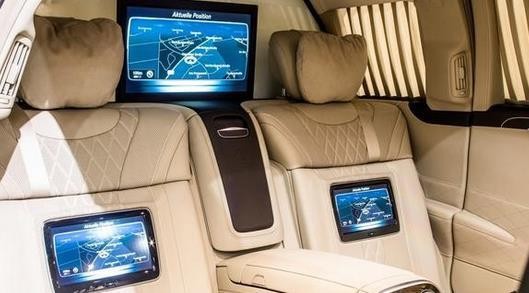 19款迈巴赫普尔曼S680拥有超大号的后排沙发,能独立调节仰角,还带有自动调节高度和伸缩的腿托,后排乘客通过按键能变成一张舒适的躺椅。中控台上看不到太多的按键设计,基本上把所有的功能都融合到了多媒体显示屏当中,而只需一个旋钮就可以进行操作,而且全部都是中文显示,简单而又轻松。