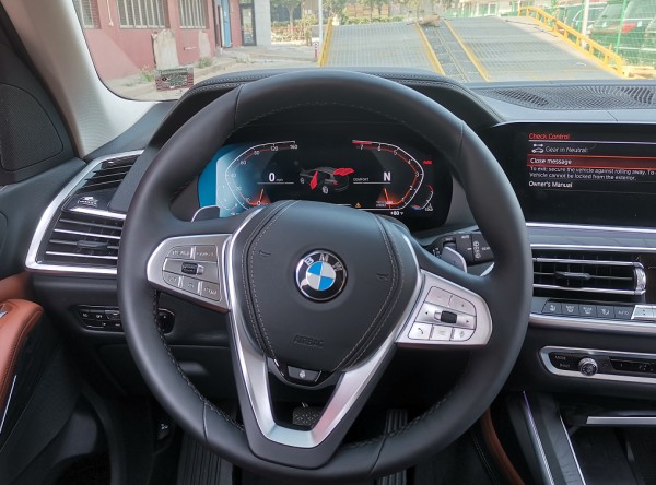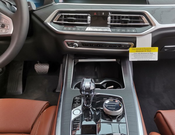 内饰部分,宝马X7采用最新家族式设计语言,使用大量真皮、木纹饰板进行包裹。配备12.3英寸带有注意力检测的全液晶仪表和12.3英寸悬浮式触控显示屏。空调出风口与温度显示屏、实体功能按键结合在同一区域,并使用银色装饰条进行点缀。下方盖板下方为带有加热、制冷功能的杯架,全新的水晶电子挡杆造型十分精致,进一步提升了车内的豪华氛围。