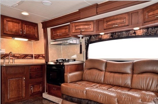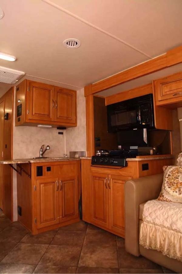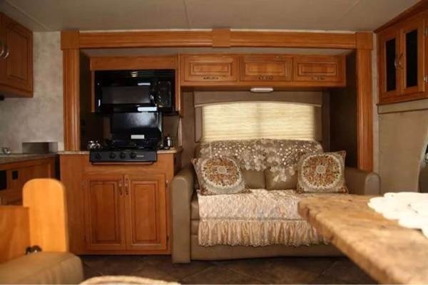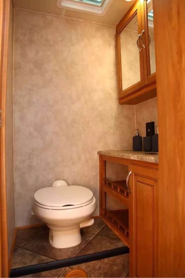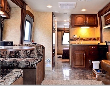 进到福特e450车内,感觉真是五脏俱全啊,厨房,餐厅,卧室,洗手间,淋浴室,而且设备家电齐全,真像个精装修的单身公寓。